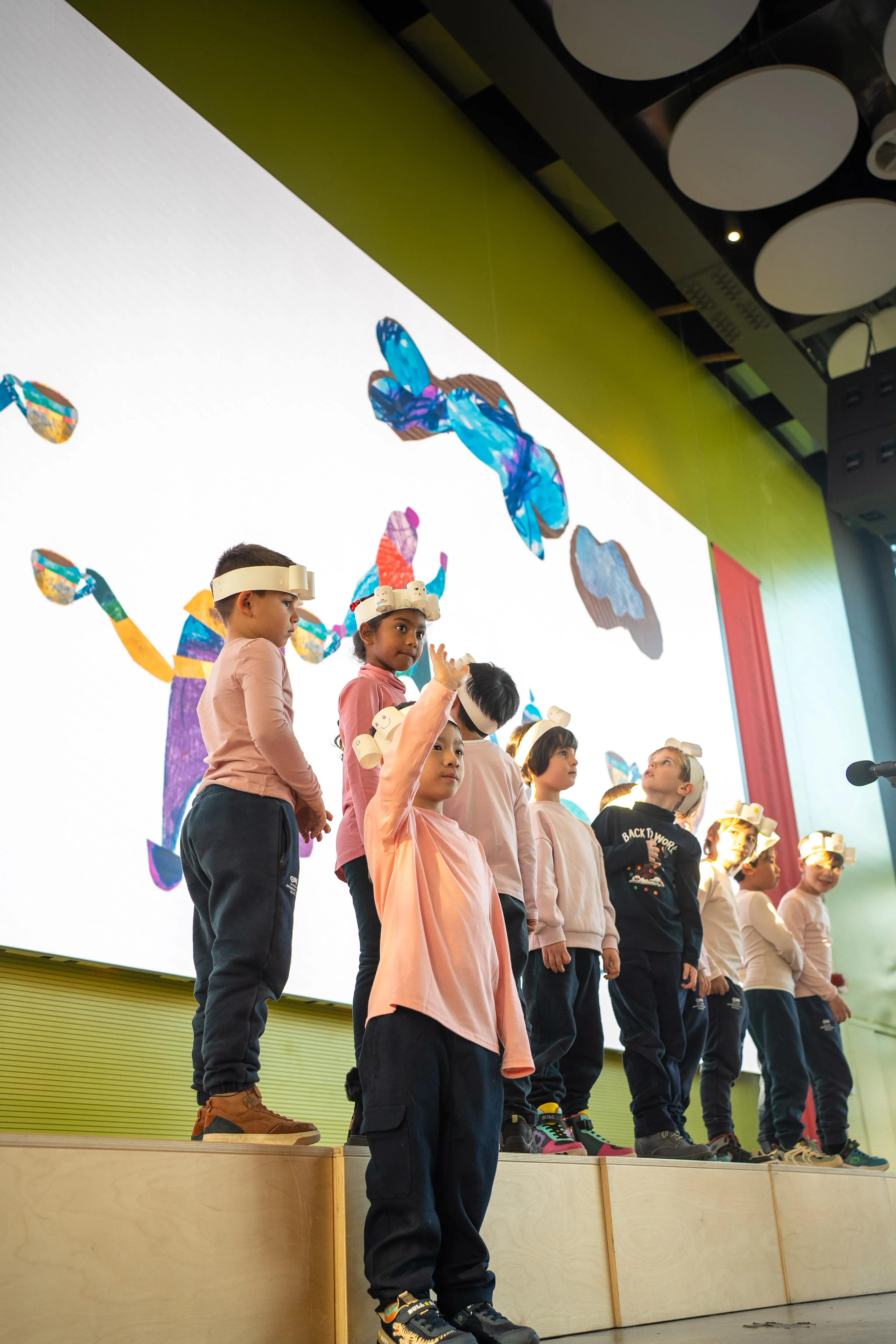 Alongside the musical work, a rich creative pathway developed, guided by the Sparx team in collaboration with the Music teacher and classroom teachers. The goal was not to “decorate” the concert, but to build a dialogue between sound and image, giving value to the creative process of the students. The visual set design, including the animations and videos projected during the event, was created entirely in the classroom, through activities carefully designed to align with each group’s age, skills and expressive languages.