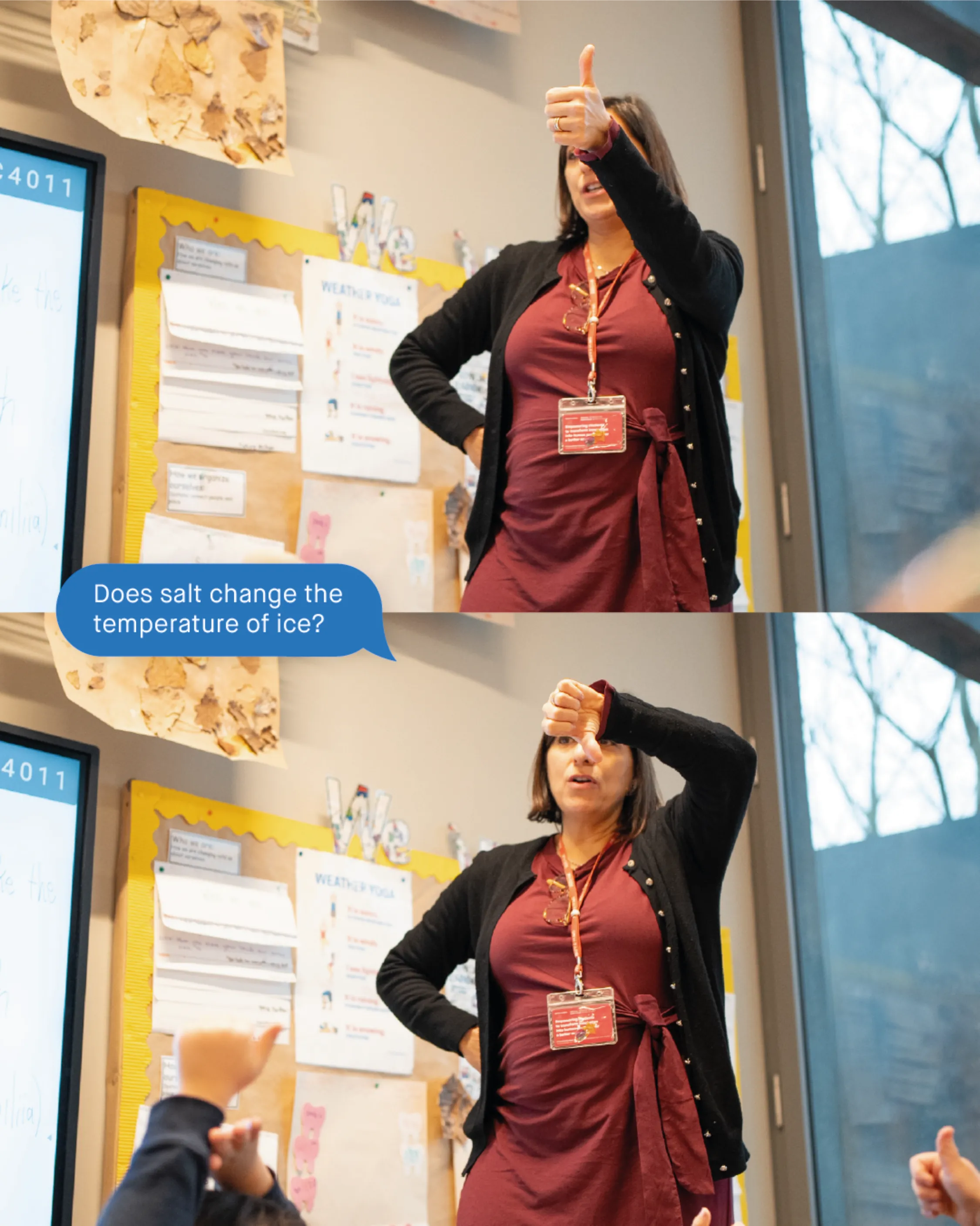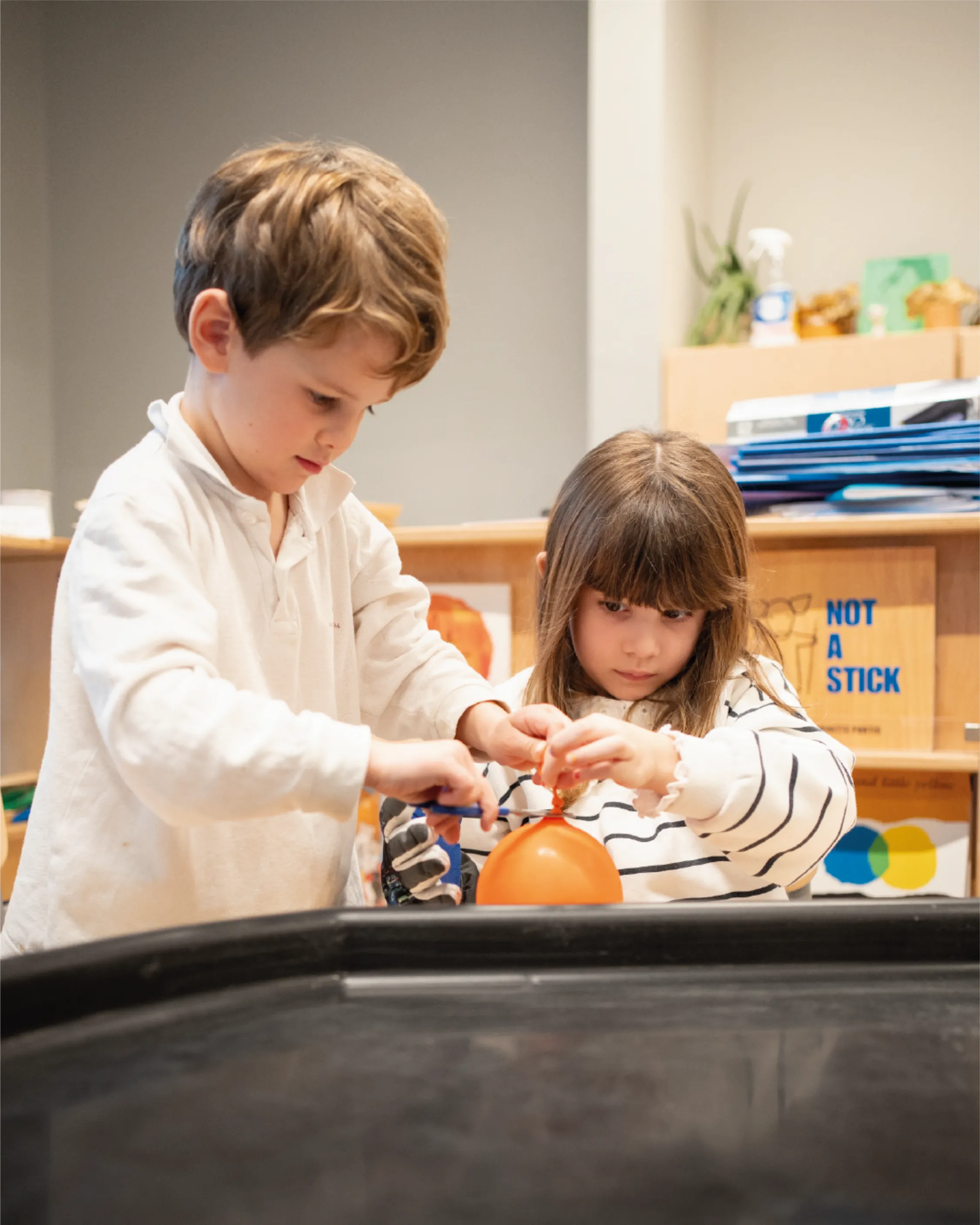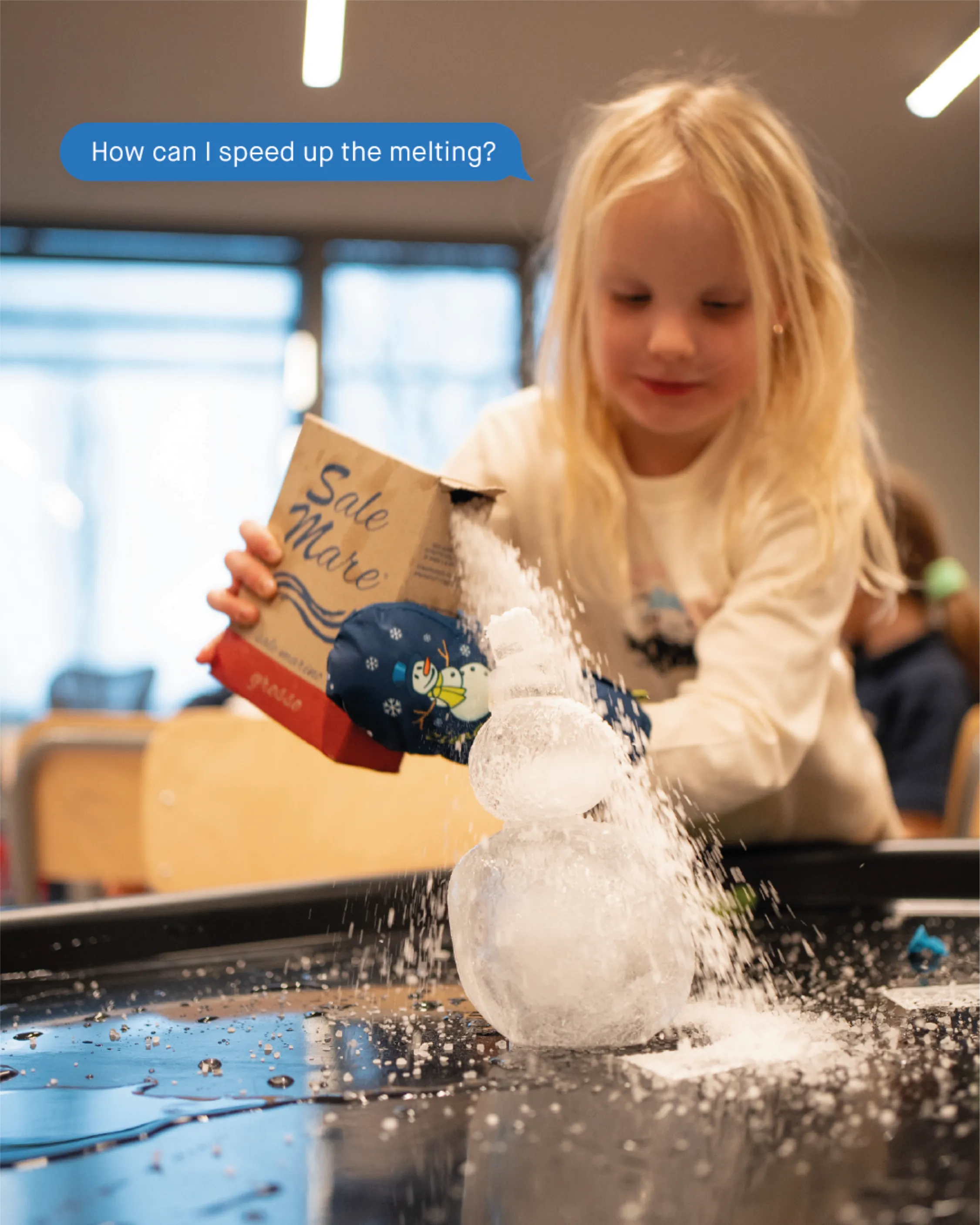 Agli studenti è stato chiesto di costruire degli “omini di ghiaccio” utilizzando sfere di ghiaccio create con palloncini congelati il giorno precedente. Attraverso tentativi ed errori, hanno scoperto che il sale poteva aiutare a unire le sfere, sciogliendo leggermente la superficie del ghiaccio e permettendo loro di “incollarsi”. Questo processo ha richiesto collaborazione, pazienza e un’attenta osservazione. I bambini hanno imparato che gli esperimenti raramente danno risultati immediati, ma si costruiscono passo dopo passo.