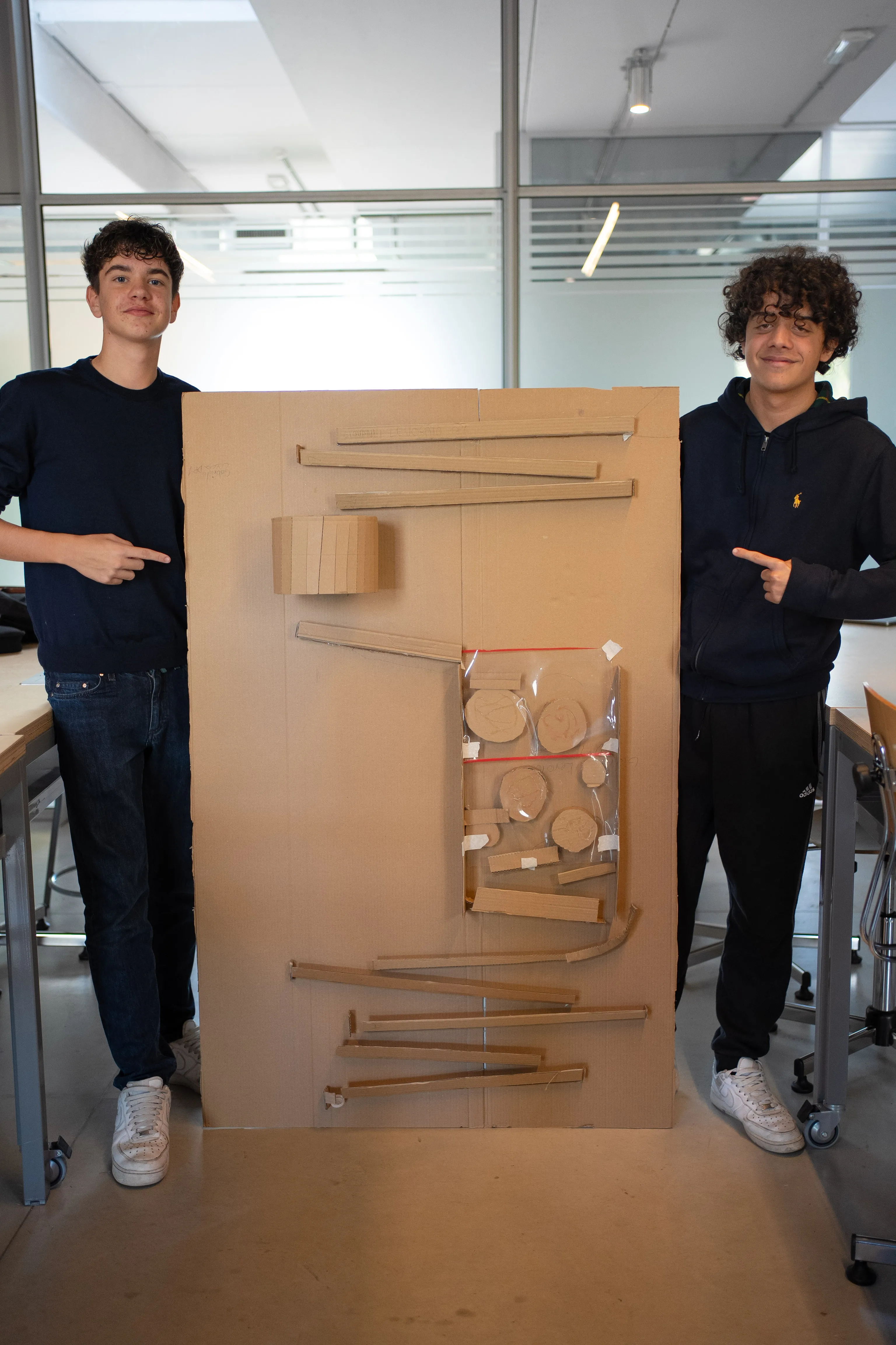 Nel Laboratorio di Design & Technology, una fila di studenti si lavora su piste costruite con cartone, plastica e nastro adesivo, osservando le biglie che si muovono, scivolano e si avvolgono tra curve progettate da loro stessi.