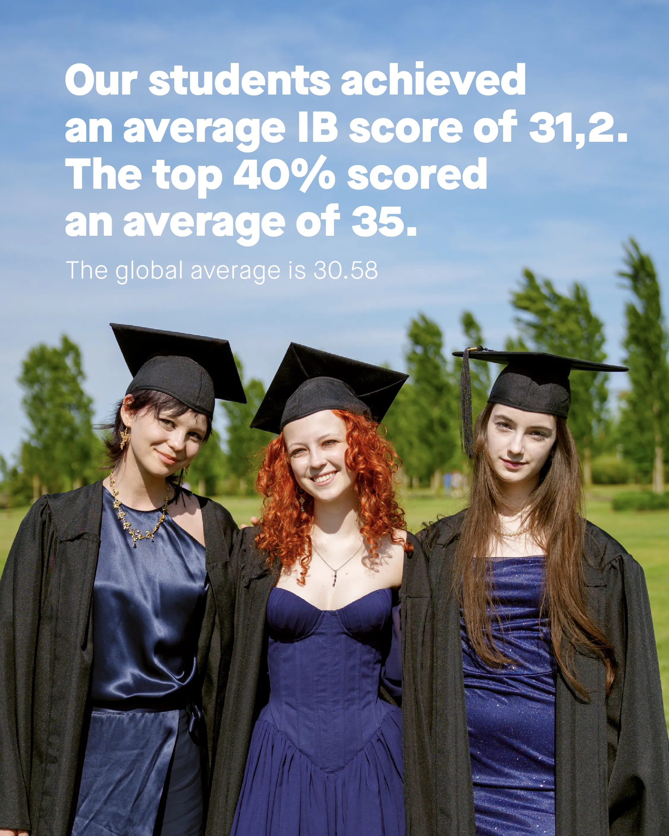Quest’anno, il punteggio medio inclusivo dei nostri studenti è stato di 31.2, superiore alla media globale di 30.58, mentre il gruppo dei migliori 40% ha raggiunto una media di 35. Oltre la metà dei diplomati – il 51,7% – ha conseguito il prestigioso Bilingual Diploma. Anche il core score si conferma in crescita, raggiungendo quota 1.8.