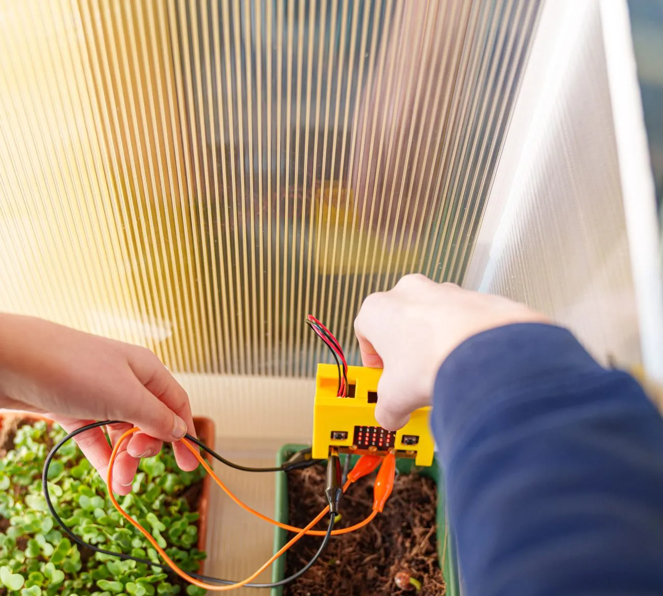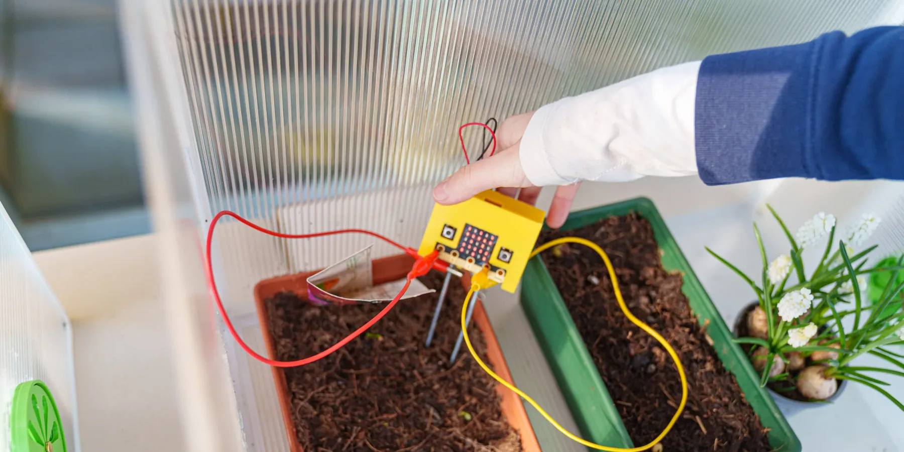 Sono stati installati sensori Micro:bit, programmati con MakeCode, per monitorare umidità del terreno e temperatura. Gli studenti hanno piantato vari semi: ravanelli, lattuga, carote, fagioli, cetrioli e fiori. Hanno inoltre utilizzato i dati dei sensori per guidare l’irrigazione e osservare i modelli di crescita delle piante.