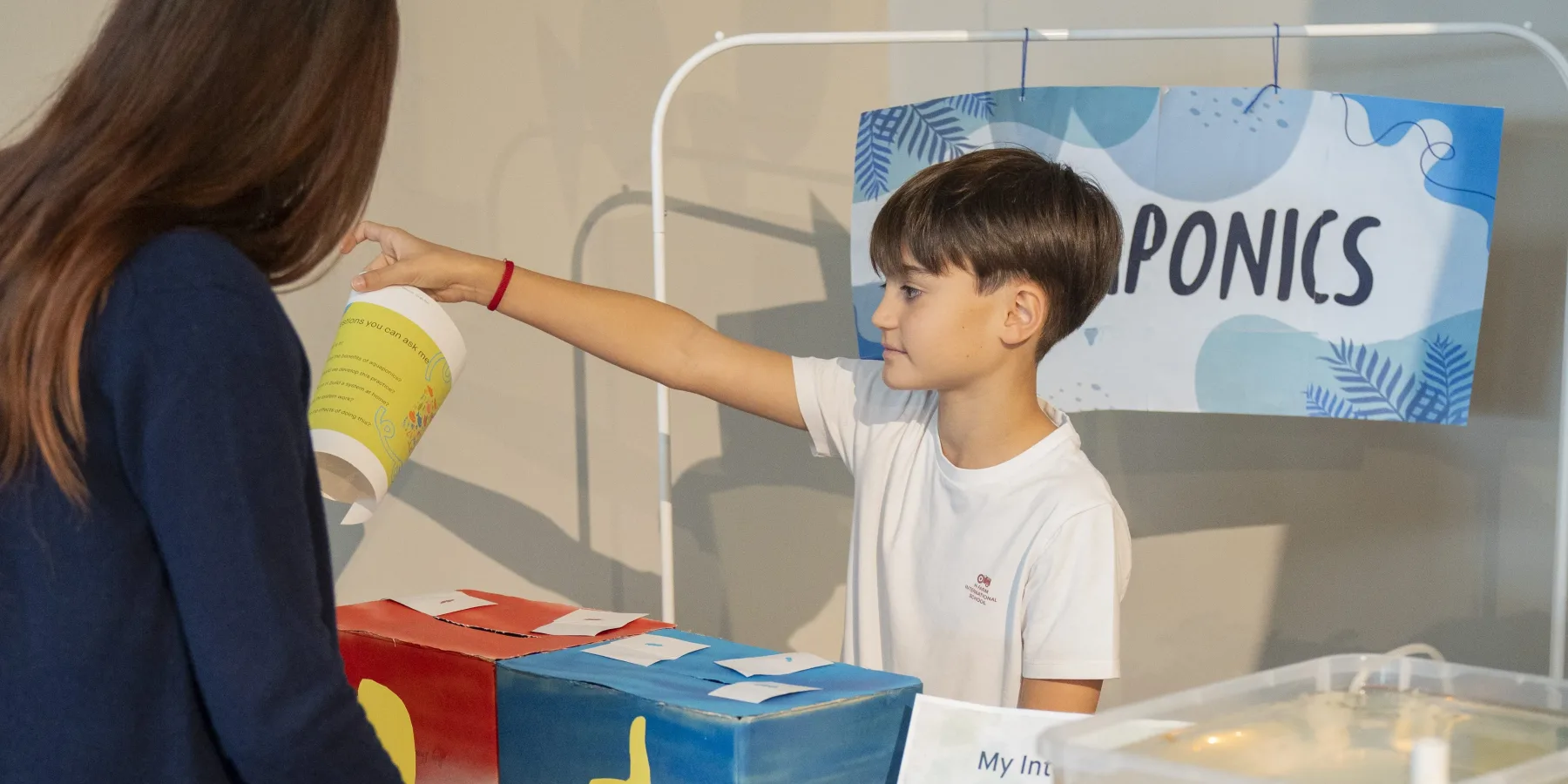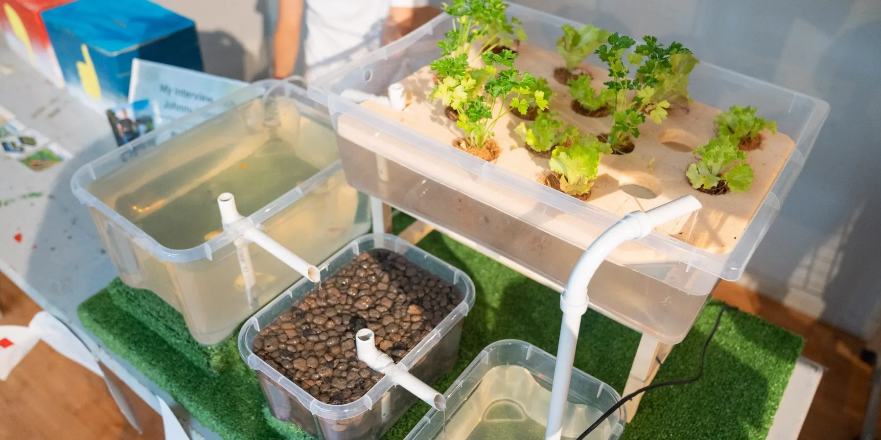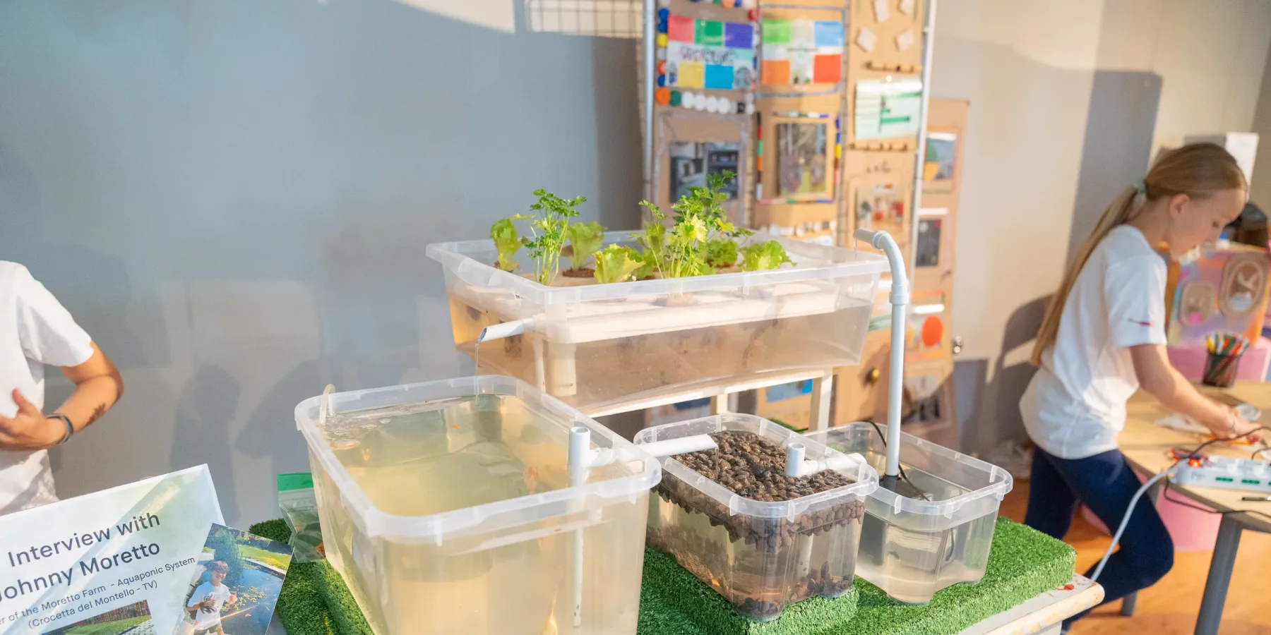 “Questo è il mio progetto”, racconta con orgoglio. “Le piante e i pesci crescono insieme, si aiutano a vicenda. È come una squadra!”. Di fronte al suo stand, oltre al sistema acquaponico realizzato con cura, si possono trovare le foto delle interviste che ha fatto, e persino un gioco pensato per coinvolgere chi si avvicina. Un vero piccolo divulgatore della sostenibilità!