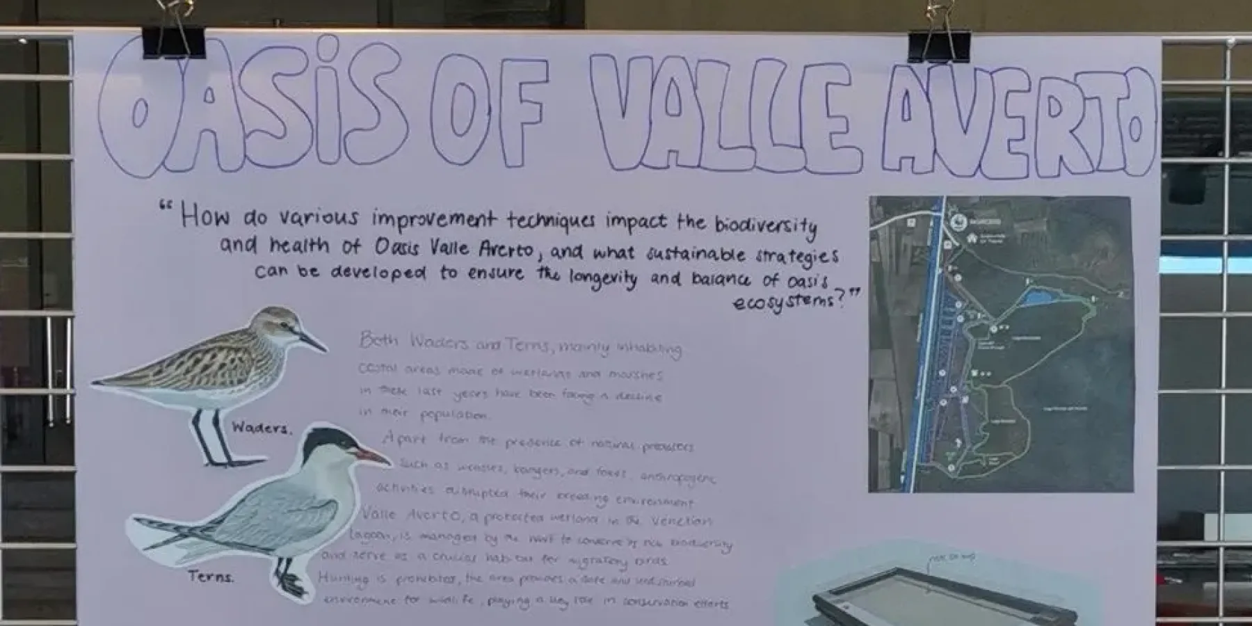 Quest’anno, il progetto si è concentrato su un problema ambientale di grande rilevanza: la riduzione della biodiversità nell’oasi. Gli studenti hanno avuto l’opportunità di esplorare l’area e identificare le principali criticità, concentrandosi in particolare sulla creazione di un ambiente sicuro per la riproduzione di due specie di uccelli: le sterne e i trampolieri.